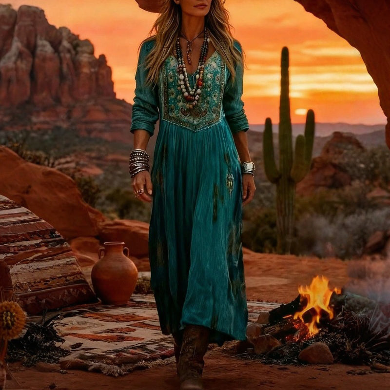Mi egy vintage-ihletésű virágmintát párosítottunk selymes esésű, puha tapintású, légáteresztő anyaggal, hogy egy olyan darab szülessen, amely éppolyan kényelmes, mint amilyen kifinomult. A laza, térd alá érő midi sziluett finoman követi az alakot, a letisztult V-nyak és a hosszú ujjak pedig könnyed eleganciát adnak a városi napokra, vacsorarandikra és a laza hétvégére. Viseld tavasszal, ősszel, sőt a hűvösebb téli napokon is csizmával vagy magassarkúval – nőies, sokoldalú és végtelenül viselhető.